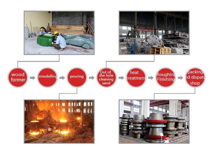 Strictly according to the process procedures to produce high-quality vertical mill roller hub: wood mold - modelling - pouring - heat preservation - out of the pit, sand cleaning - heat treatment - roughing, finishing - packing and delivery.